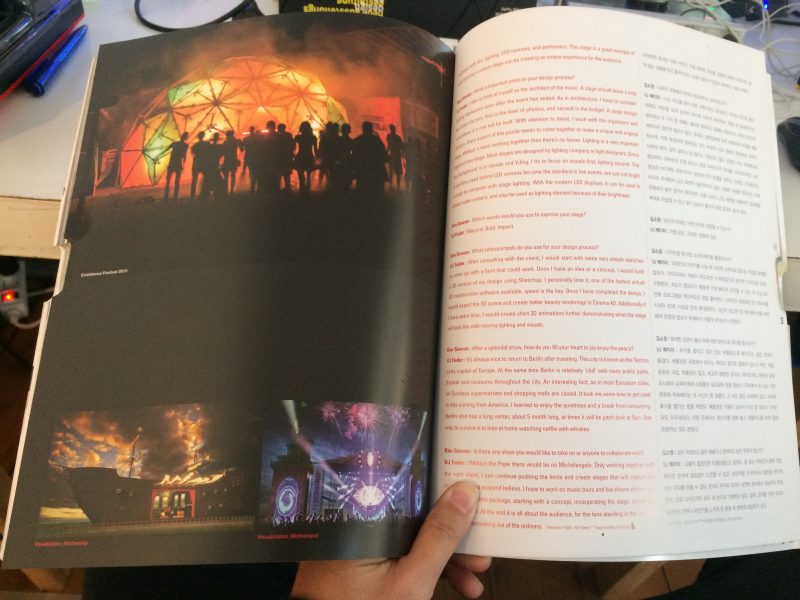 김소원 : 디자인 과정에서 무엇이 중요하다고 생각하는가? VJ페이더:나는자신을음악전문건축가라고생각한다.무대는자고로끝난 뒤에도 여운을 오래 남겨야 하기에 건축적 측면에서 봤을 때 중점적으로 생각하는 두 가지 중 첫째는 물리학 법칙이고 둘째는 예산이다. 무대 디자인은 세워지지 않으면 쓸모가 없다. 주최자, 협력업체와 모여 세세하게 무대를 계획 하는데, 이때 복잡하게 얽혀있는 모든 부분이 서로 맞물려 독창적인 무대가 나와야 한다. 같이 일하는 팀 없이는 지원군도 없다. 조명은 어느 무대에서나 중요하다. 대부분은 조명 회사나 조명 디자이너가 무대를 디자인하지만, 나는 영상과 브이제잉 전문이어서 영상에 먼저 초점을 맞추고, 조명은 그다음이다. 라이브 무대에서 LED 화면이 일반적이지 않던 시절에 사용한 영사기는 무대 조명보다 밝지 않아서 묻히지만, 요즘 나오는 LED 화면을 사용하면 영상물을 제대로전달할수있고밝기성능이좋아서조명효과도낼수있다.